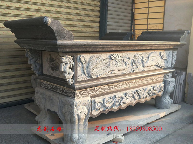 石雕供桌就是陳設供品的桌子,利用石材雕刻而成。石雕供桌常見款式為長方形,石頭材質屬于青石,面中間是一精致的供桌,雕刻一龍王看廟,高度約與方桌相等。祭祀時常供設香爐、蠟竿和擺放供品,此為石頭所制,故名石供桌。供桌常見幾種地方擺放,廳堂供桌、佛堂供桌、寺廟供桌、神臺供桌等,與其配套的有香爐、石鼎。