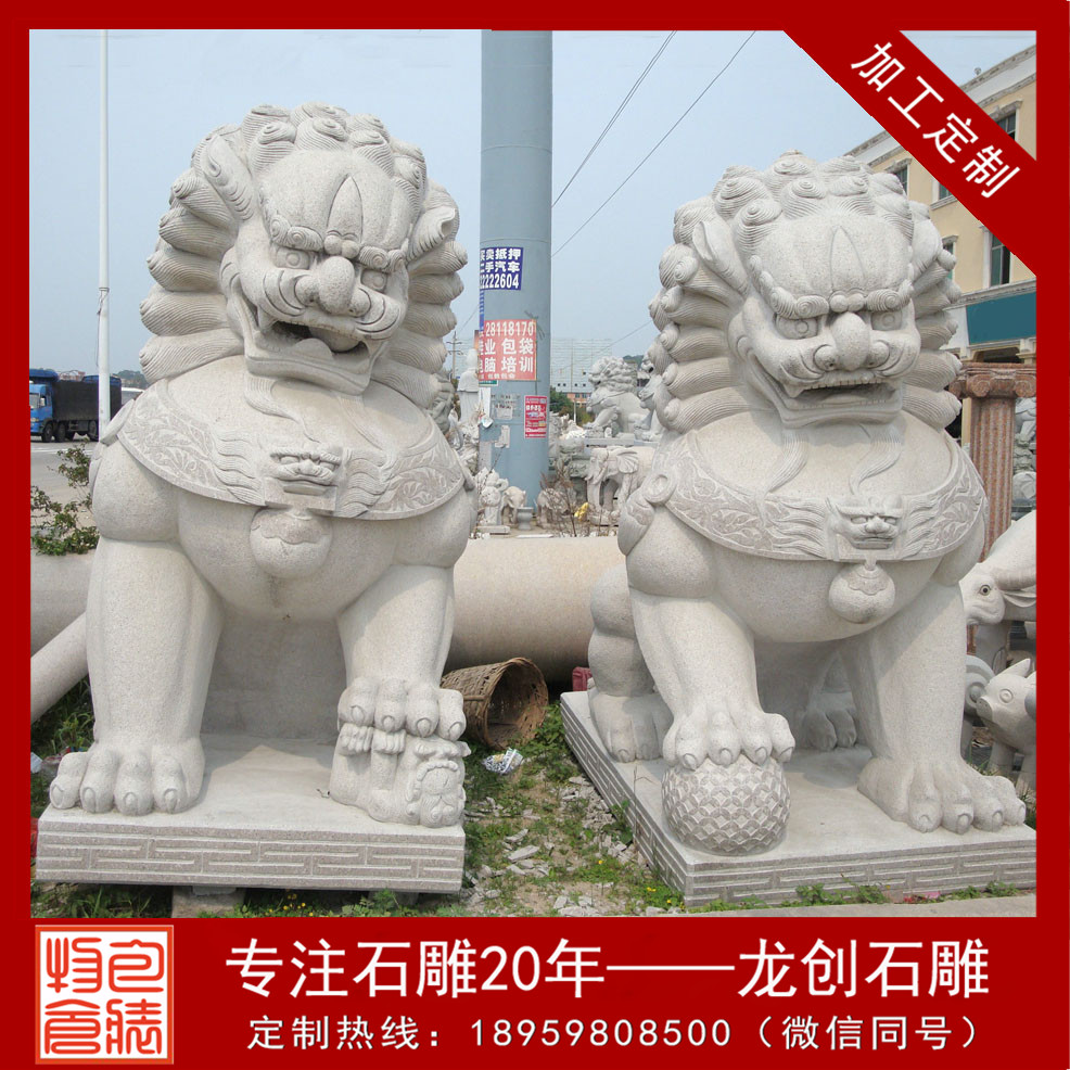 龍創石雕雕刻漢白玉石獅子雕塑的歷史已有上千年,因其有驅邪辟祟的作用,所以始終備受青睞。舊時,皇宮、王府、陵墓門前大多數都放置的獅子,卷發巨眼,張口施爪,總是成對的放置。左邊是雄的,右邊的是雌的,雄獅爪下有一個繡球,雌獅的爪下是一個幼崽。獅子頭上凸出的皺褶按它守衛主人的官階而定,因此成了權勢的象征。而民間的石獅子多顯溫馴,用來作為鎮宅驅邪之吉祥物。